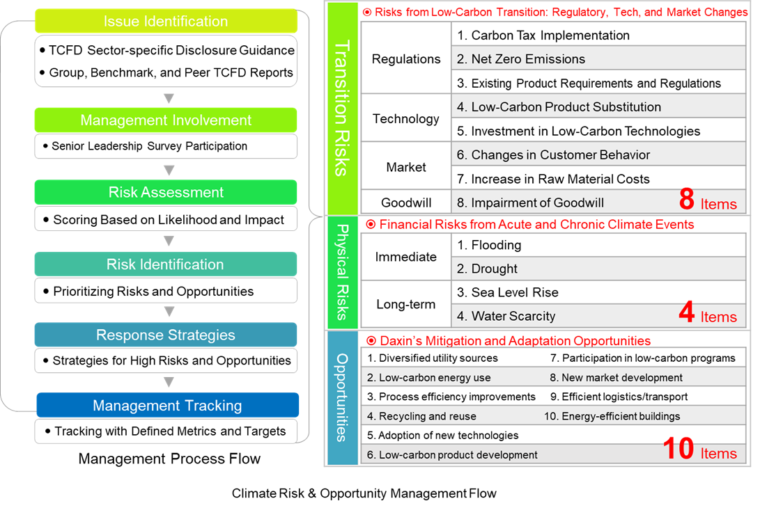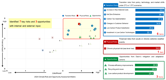 The company refers to international sustainability trends and benchmark enterprises‘ TCFD reports to assess the likelihood and financial impact of various climate-related risks and opportunities. Through joint discussions between responsible departments and external experts, in 2024, Daxin identified a total of 7 major risks (including 6 transition risks and 1 physical risk) and 3 opportunities that require attention, and has developed corresponding response strategies.