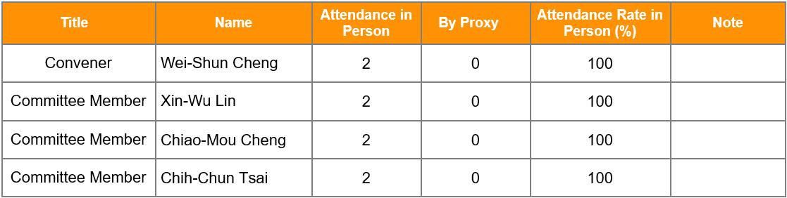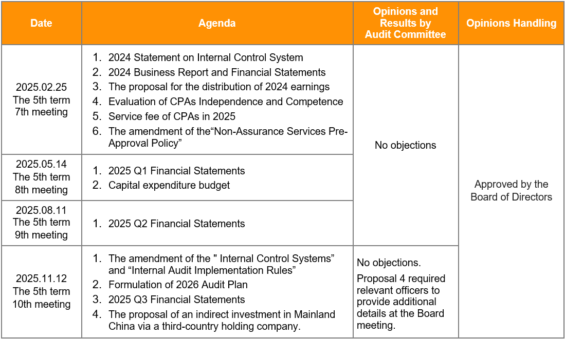 The Audit Committee assists the Board in executing its financial oversight responsibilities and other duties as set forth in the Company Act, the Securities and Exchange Act, and other applicable laws and regulations. Matters required to be reviewed by the Audit Committee include the Company‘s financial statements, auditing and accounting policies and procedures, internal control systems, matters relating to the personal interests of directors, material asset or derivatives transactions, material monetary loans, endorsements, or provisions of guarantees, the offering or issuance of equity-type securities, the engagement, dismissal, or compensation of an attesting CPA, and the appointment or dismissal of financial, accounting, or internal auditing officers.