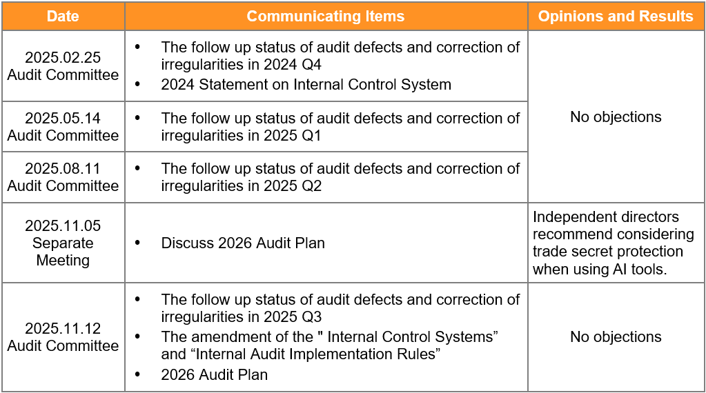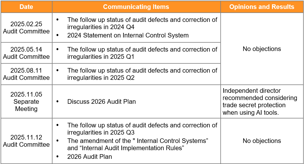 Monthly audit reports and follow-up reports by the chief internal audit are delivered to the Audit Committee for review by the end of the following month. The chief internal audit attends the Audit Committee and the Board of Director to present audit reports, follow-up reports, annual audit plans, and the result of self-assessments of internal control every quarter, and communicates the annual audit plan with independent directors individually every year. Independent directors learn about the company‘s operating conditions and audit conditions through the Board of Directors, the Audit Committees, and the Auditing Administration Division regularly reports. We communicate efficiently through telephone, fax, email and other channels. In case of material events, the meetings may be convened at any time.