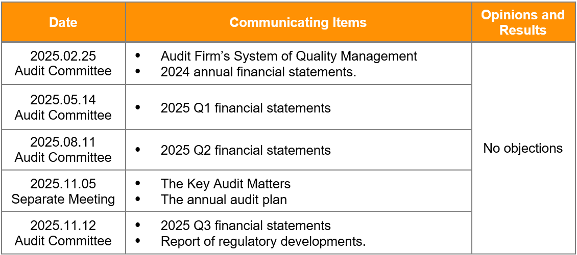 The independent directors and CPAs have regular meetings at least four times a year. The CPAs present audit results of financial reports to independent directors to explain the important transactions and the audit results of internal control. CPAs communicate the Key Audit Matters, the annual audit plan, the method of audit tests and the audit procedures with independent directors individually every year. In case of material events, the aforementioned meetings may be convened at any time.
