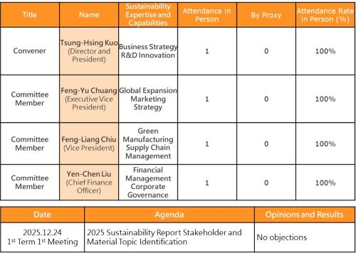 The company established a cross-departmental Sustainable Development Committee in 2021. On August 11, 2025, the Board of Directors resolved to establish a "Sustainable Development Committee" under the Board‘s governance. Its primary responsibilities are as follows: