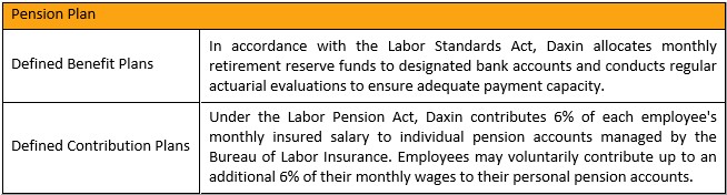 - Retirement Policy:Since establishment in 2006, Daxin has maintained compliance with the Labor Standards Act and Labor Pension Act by implementing both defined benefit and defined contribution pension schemes to safeguard employees‘ post-retirement financial security and demonstrate our enduring commitment to employee welfare.
