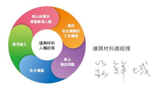 達興材料恪守各營運據點所在地法規,以保護人權和營造有尊嚴的工作環境,並依循《聯合國世界人權宣言》、《國際勞動公約》、《聯合國全球盟約十項原則》等國際標準,同時採取與責任商業聯盟行為準則(The Responsible Business Alliance, RBA),以及台灣『勞動基準法』一致的行動,確保員工能在尊嚴和安全環境下工作。我們致力於創造尊重人權的環境,落實於所有員工。