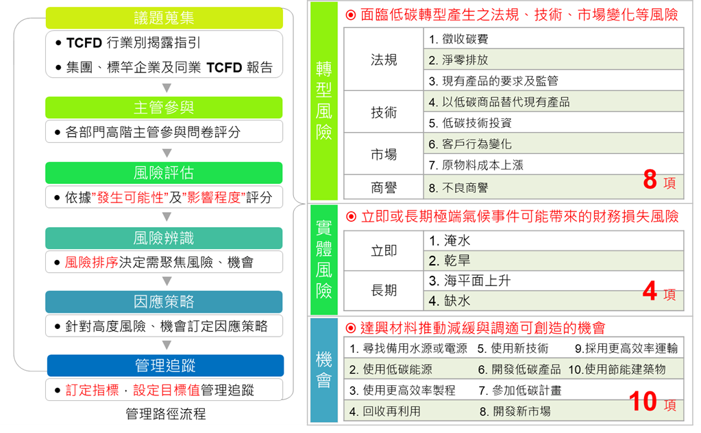 2024年首度依據TCFD架構完成「氣候變遷風險與機會評估」,並由永續發展委員會統籌召開六次跨部門溝通會議,建立「氣候變遷風險與機會管理流程」。涵蓋議題蒐集、主管參與、風險評估、風險辨識、因應策略及管理追蹤等六個階段,以系統化方式鑑別應關注之氣候重大風險與機會。