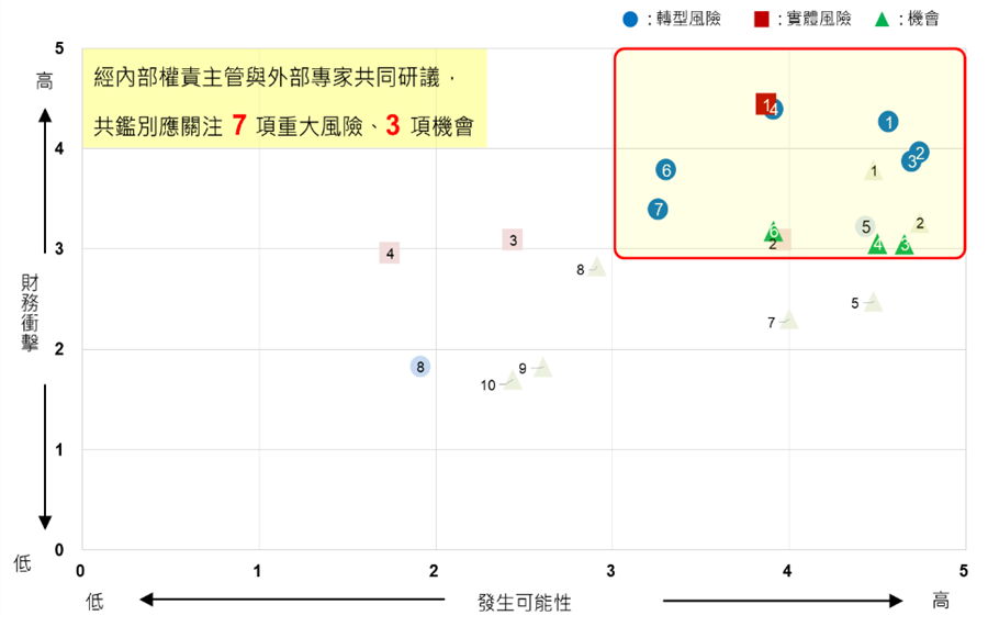 本公司參考國際永續趨勢及標竿企業TCFD報告,評估各項氣候相關風險與機會發生之可能性及財務衝擊。經由權責部門與外部專家共同討論,2024年共鑑別達興材料應關注之7項重大風險(包含6項轉型風險與1項實體風險)及3項機會,並研擬相關因應對策。