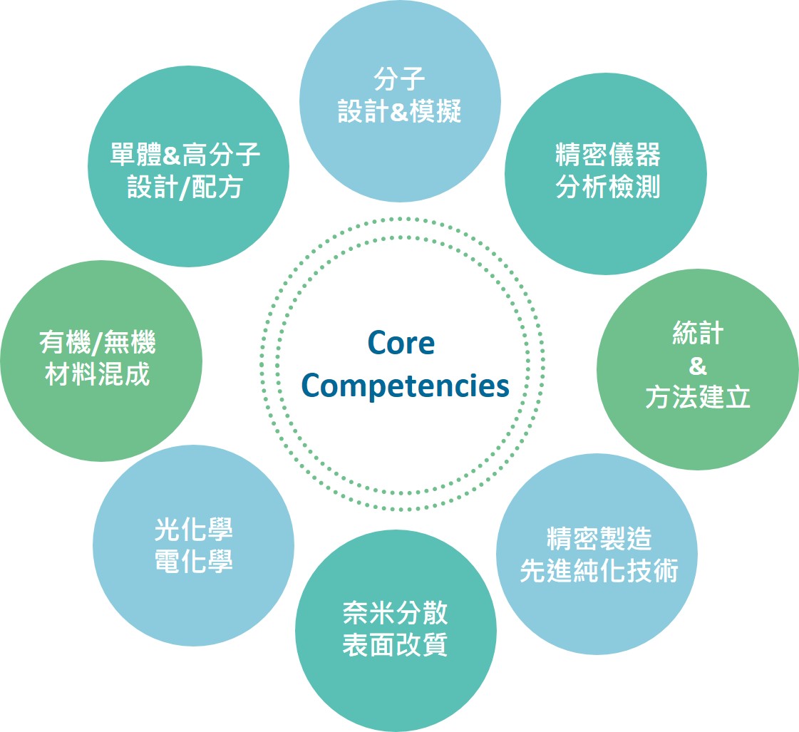 達興材料以紮實的Fundamental Knowledge,發展多種核心技術,包含光化學、分子結構設計、單體與高分子設計與配方、表面化學、分散科學、有機無機材料混成技術、奈米材料開發、色彩模擬及半導體所需精密製造與純化等,提供半導體與顯示器應用領域最先進及客製化的化學材料。